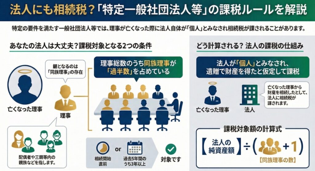 国税庁タックスアンサーの「No.4143 特定の一般社団法人等に対する課税」について解説します。 解説動画 https://youtu.be/MFjmtzmq4mo 概要 特定の一般社団法人等(公的なものを除く)の理事が死亡した場合、その法人が遺贈により財産を取得したとみなさ... -