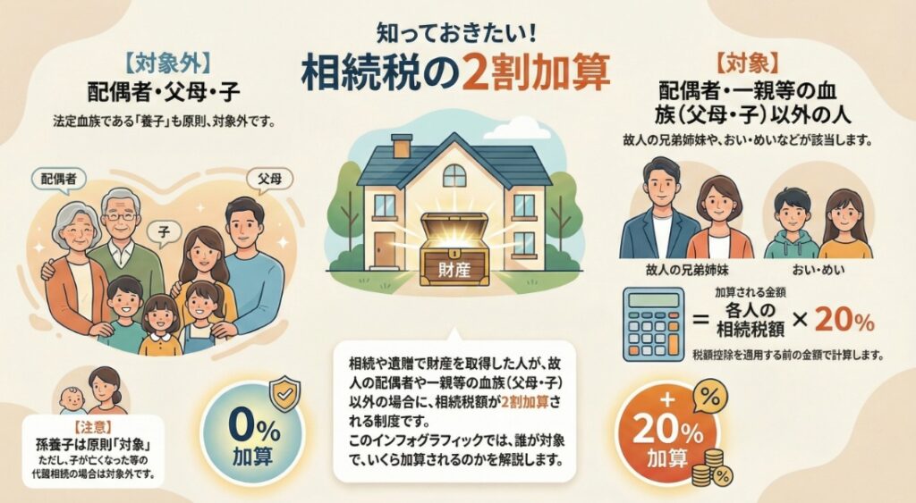 国税庁タックスアンサーの「No.4157 相続税額の2割加算」について解説します。 解説動画 概要 相続税の2割加算とは、財産を取得した人が被相続人の配偶者や一親等の血族(父母・子)以外である場合に、その人の相続税額に2割相当額が加算される制度です。 ... -