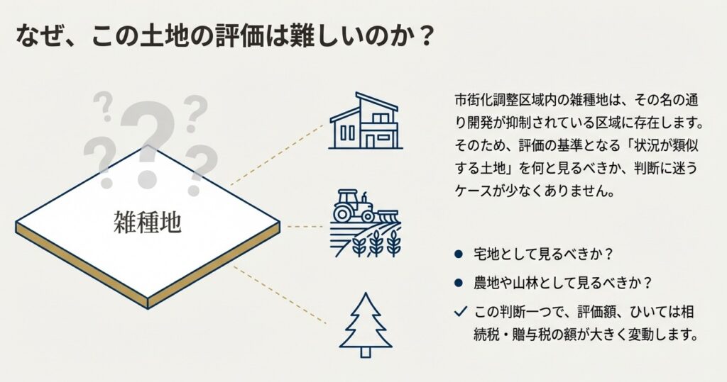 国税庁タックスアンサーの「No.4628 市街化調整区域内の雑種地の評価」について解説します。 解説動画 https://youtu.be/pa3rgUZ6TgM 概要 市街化調整区域内の雑種地(ゴルフ場用地等を除く)の評価は、相続税や贈与税の対象となります。価額は、原則とし...