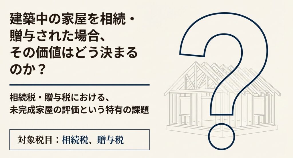 国税庁タックスアンサーの「No.4629 建築中の家屋の評価」について解説します。 解説動画 https://youtu.be/-f9ghXnpCaQ 概要 建築中の家屋の評価は、相続税および贈与税の対象です。 家屋の価額は原則として固定資産税評価額に1.0を乗じて計算しますが、... -