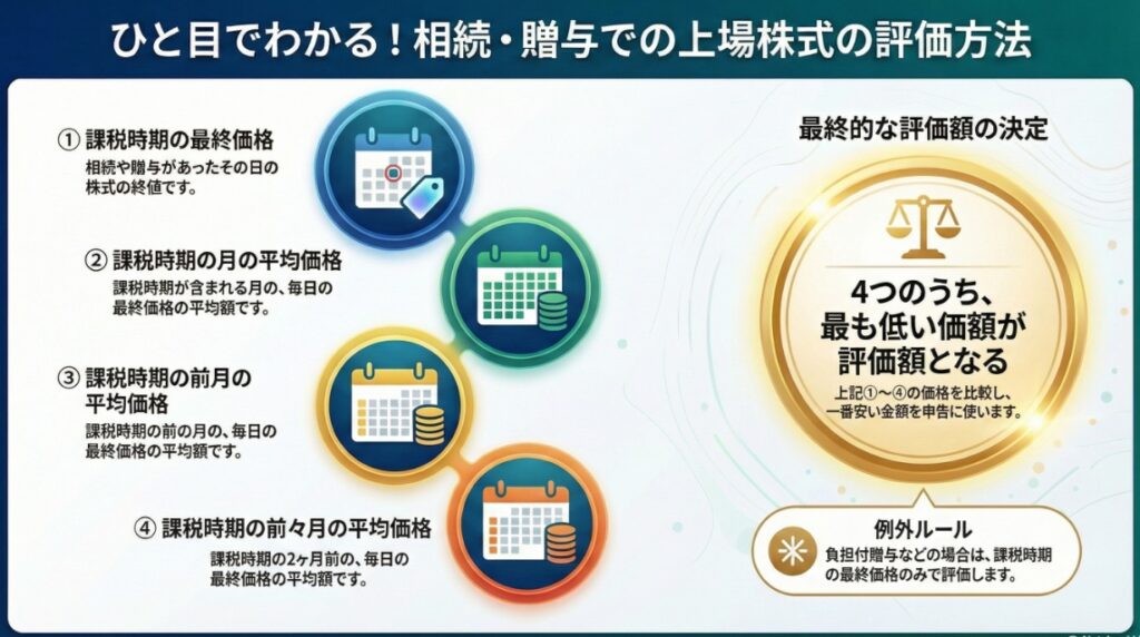 国税庁タックスアンサーの「No.4632 上場株式の評価」について解説します。 解説動画 https://youtu.be/lWze9OntiXI 概要 上場株式とは、金融商品取引所に上場されている株式を指し、相続税や贈与税の対象となります。 その価額は原則として、上場されてい... -