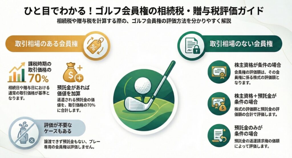 国税庁タックスアンサーの「No.4647 ゴルフ会員権の評価」について解説します。 解説動画 https://youtu.be/jyh-iMptXP8 概要 ゴルフ会員権の評価は、相続税や贈与税を計算する際に適用されます。評価方法は、その会員権に取引相場があるか否かによって大... -
