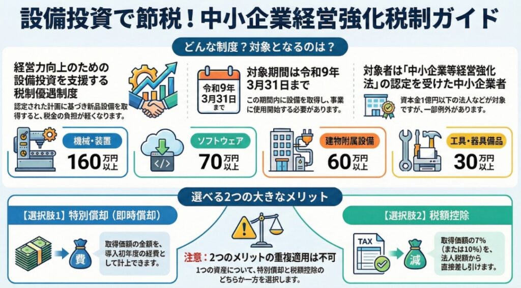 国税庁タックスアンサーの「No.5434 中小企業経営強化税制(中小企業者等が特定経営力向上設備等を取得した場合の特別償却又は税額控除)」について解説します。 解説動画 https://youtu.be/3KBmu206pY4 概要 中小企業経営強化税制は、経営力向上計画の認... -