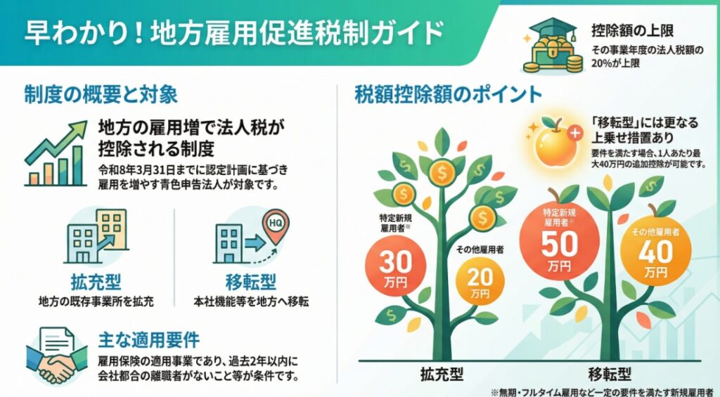 国税庁タックスアンサーの「No.5926 地方活力向上地域等において雇用者の数が増加した場合の法人税額の特別控除」について解説します。 解説動画 https://youtu.be/dTEUAQFvWv4 概要 地方活力向上地域等における雇用促進税制は、認定計画に基づき地方で雇... -