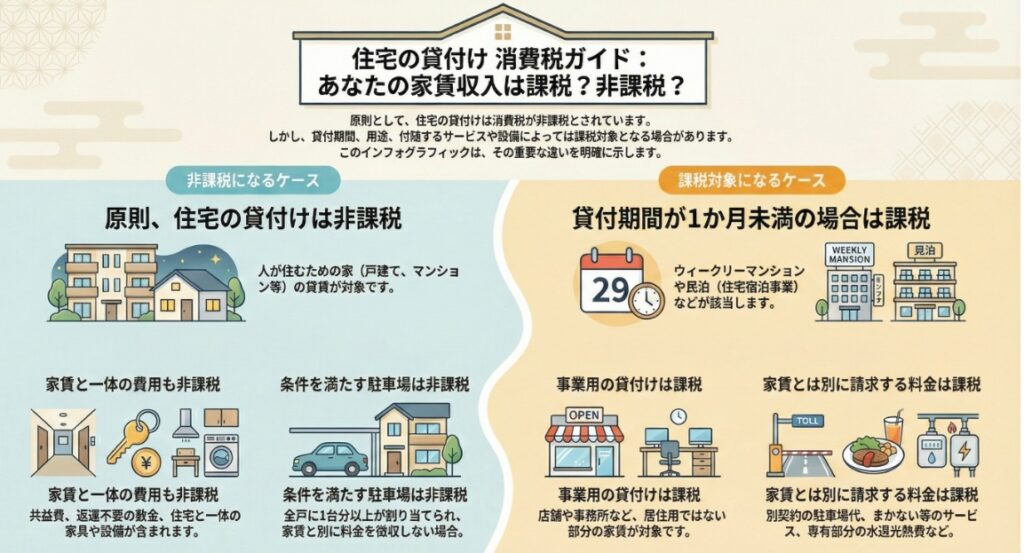 国税庁タックスアンサーの「No.6226 住宅の貸付け」について解説します。 解説動画 https://youtu.be/tDnSdWlxS70 概要 住宅の貸付けは、消費税の対象税目において原則として非課税とされます。この非課税措置が適用される「住宅」には、一戸建て、マンシ... -