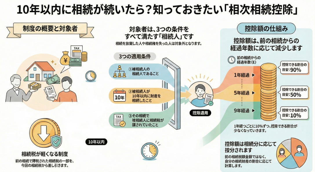 国税庁タックスアンサーの「No.4168 相次相続控除」について解説します。 解説動画 https://youtu.be/j9aP_kBZ05g 概要 相続税の「相次相続控除」とは、今回の被相続人が亡くなる前10年以内に相続等で財産を取得し、相続税が課されていた場合に、その被相... -