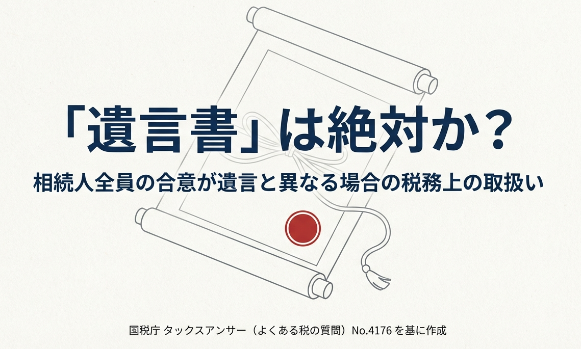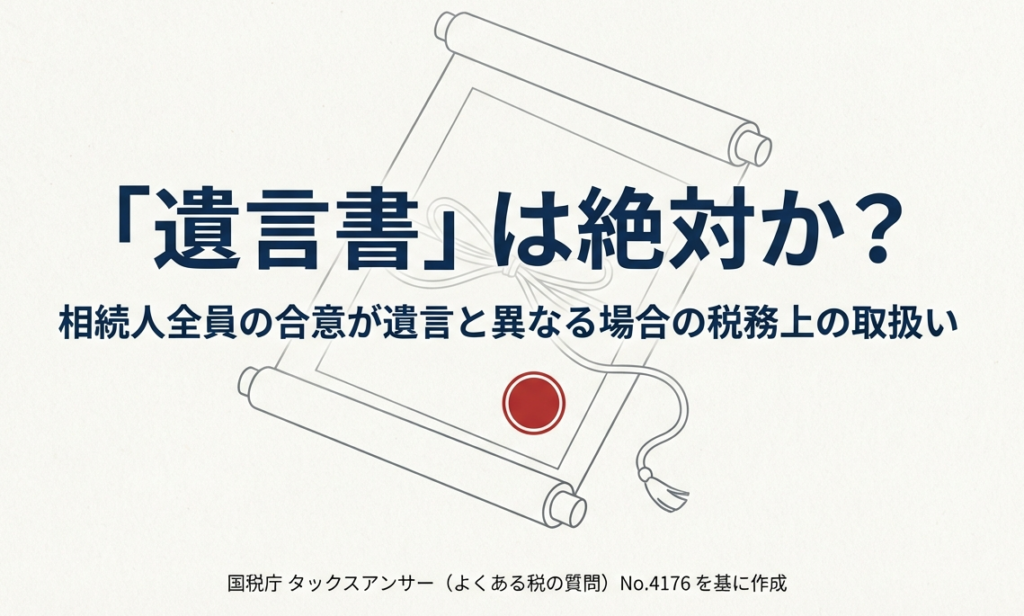 国税庁タックスアンサーの「No.4176 遺言書の内容と異なる遺産分割をした場合の相続税と贈与税」について解説します。 解説動画 https://youtu.be/BYeYZbdttdw 概要 遺言書で特定の相続人に全財産を与える旨の指定があっても、相続人全員の合意があれば、... -