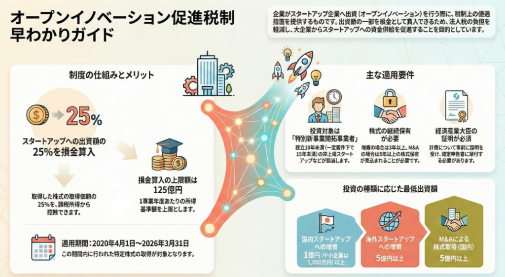 国税庁タックスアンサーの「No.5575 オープンイノベーションを促進するための税制」について解説します。 解説動画 https://youtu.be/GoFVcDO2Mjo 概要 オープンイノベーション促進税制は、青色申告法人が一定のスタートアップ企業(特別新事業開拓事業者... -