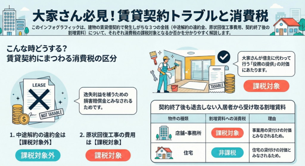 国税庁タックスアンサーの「No.6261 建物賃貸借契約の違約金など」について解説します。 解説動画 https://youtu.be/aBAG2Trxlbo 概要 建物賃貸借契約に関して生じる様々な金銭の消費税の扱いは、その金銭が何を対価とするか、あるいは損害賠償金であるか... -