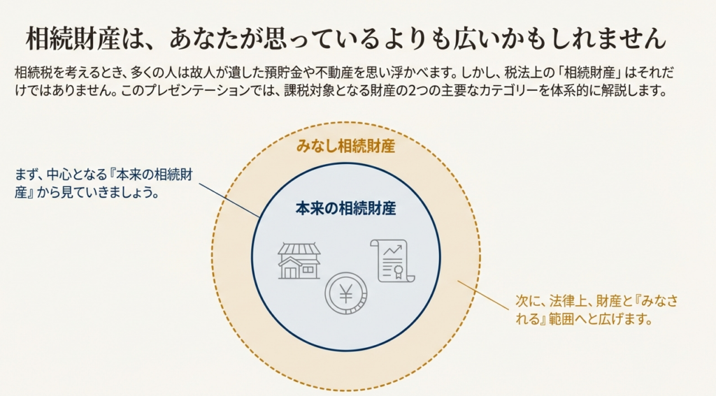国税庁タックスアンサーの「No.4105 相続税がかかる財産」について解説します。 解説動画 https://youtu.be/edCmsA7vE_s 概要 相続税は、死亡した人の財産を相続や遺贈(死因贈与を含む)によって取得した場合に課税されます。 課税対象となる財産は大きく... -