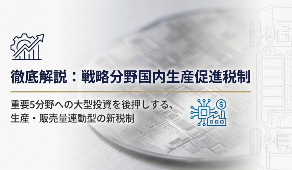 国税庁タックスアンサーの「No.5922 戦略分野国内生産促進税制」について解説します。 解説動画 https://youtu.be/mjnlpP96mO8 概要 戦略分野国内生産促進税制は、半導体や電気自動車、鉄鋼、基礎化学品、燃料といった重要物資の国内生産を促す制度です。... -
