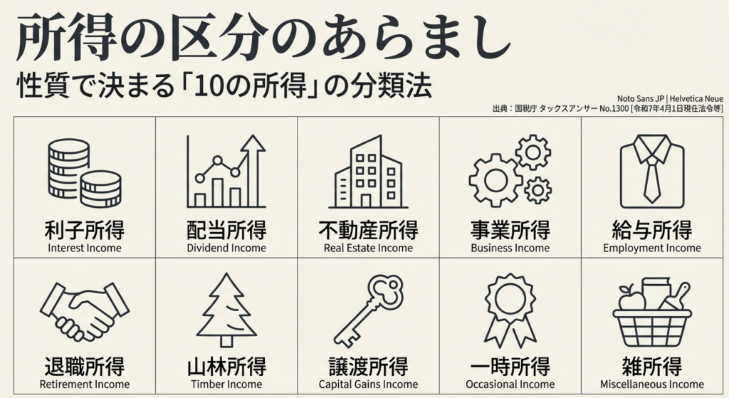 国税庁タックスアンサーの「No.1300 所得の区分のあらまし」について解説します。 解説動画 https://youtu.be/pwtePIqlOOE 詳細 所得税法では、所得はその性質によって以下の10種類に区分されています。 1. 利子・配当・不動産所得:預貯金の利子、株式の... -