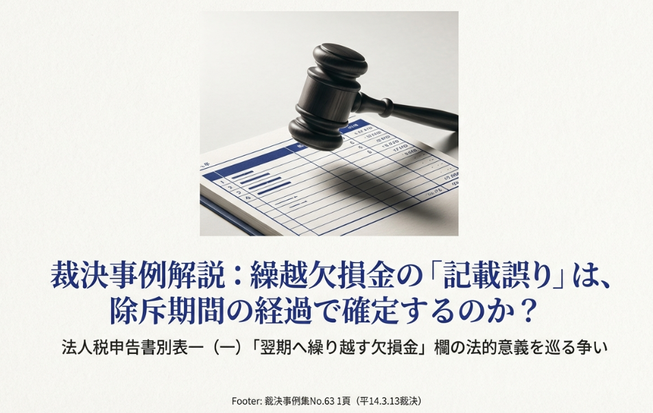 平成14年3月13日に公表されたこの裁決は、法人税申告書別表一(一)の「翌期へ繰り越す欠損金」欄に誤って過大な金額を記載してしまったケースを扱っています。納税者は「記載誤りがあった事業年度の除斥期間(5年)が過ぎたのだから、その金額は確定しており、控除は正当だ」と主張しました。