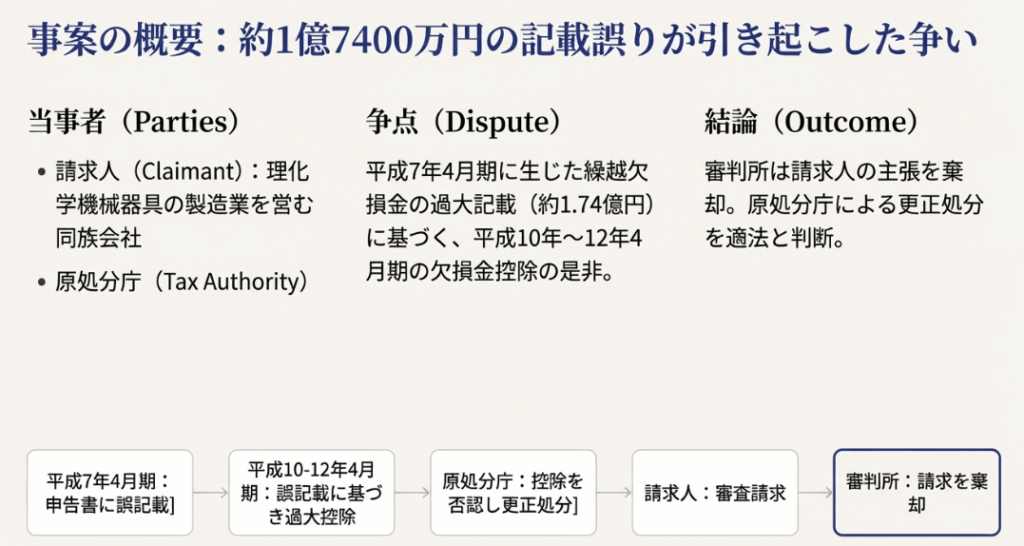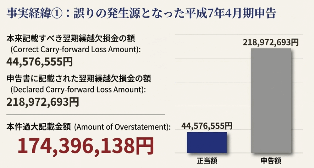 平成7年4月期の法人税申告書において、「翌期繰越欠損金」の額を本来**「44,576,555円」とすべきところ、「218,972,693円」**と誤って過大に記載した。