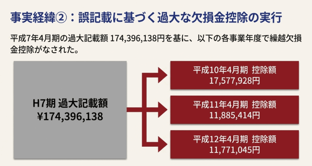 この過大記載された金額を基に、平成8年4月期から平成12年4月期までの各事業年度で、本来は存在しないはずの欠損金を控除し、過少な所得で申告を続けた。