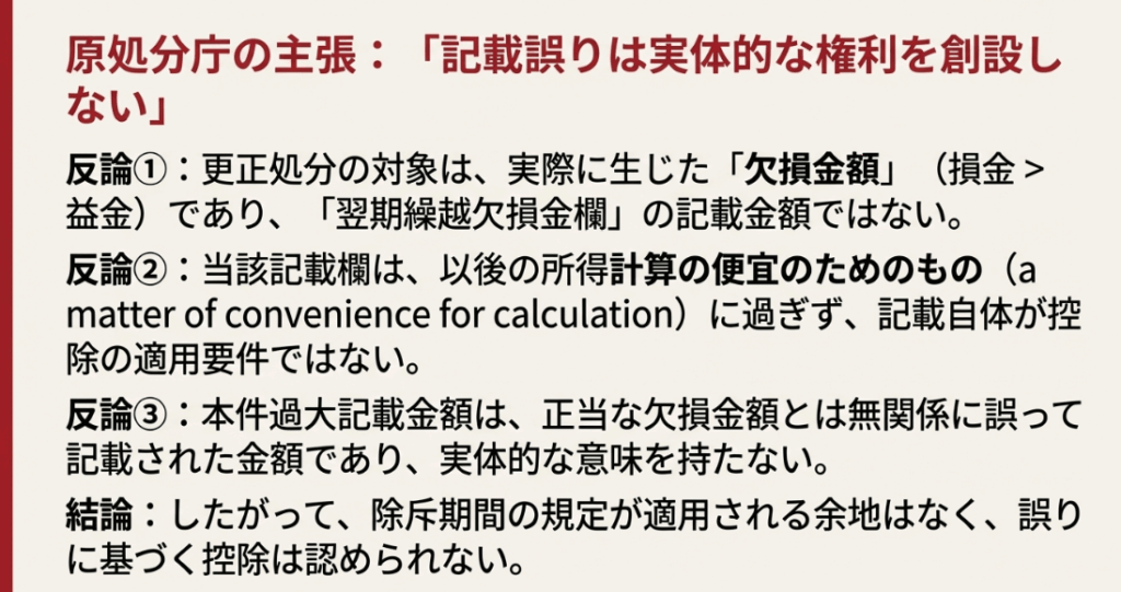 一方、申告書の「翌期繰越欠損金額」欄は、その赤字の残高を翌期に引き継ぐための、いわば計算上の「メモ欄」に過ぎません。課税庁は、この「メモ欄」のタイプミスが、存在しないはずの巨額の欠損金を生み出すことはあり得ないと主張したのです。