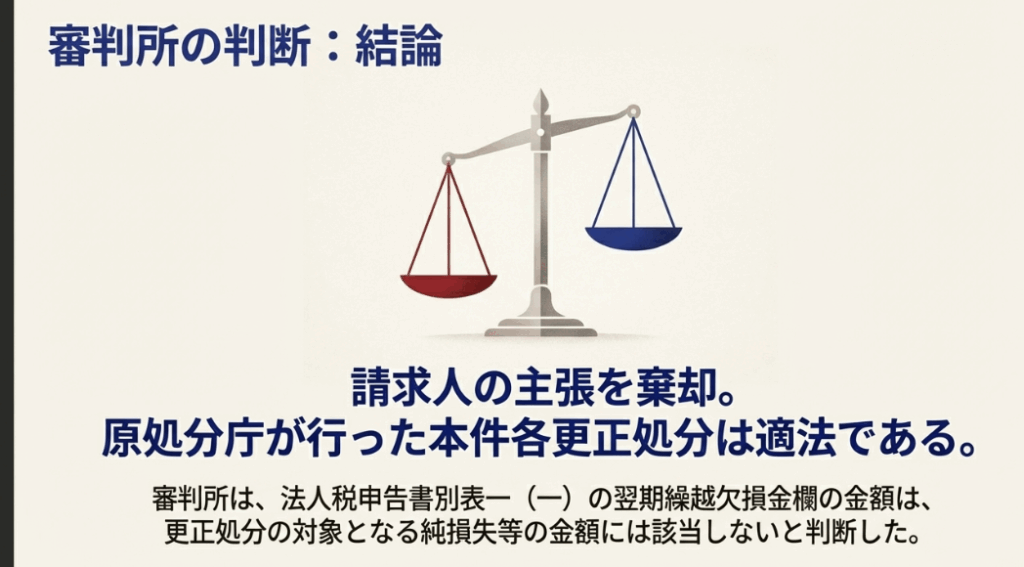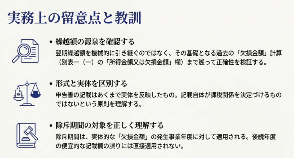これらの理由から、審判所は「翌期繰越欠損金欄の記載誤りは、その誤りが生じた事業年度(平成7年4月期)の除斥期間とは無関係」であり、「その誤った記載に基づいて過大な控除が行われた事業年度(平成10年4月期~平成12年4月期)に対して更正処分を行ったことは適法である」と最終判断を下しました。