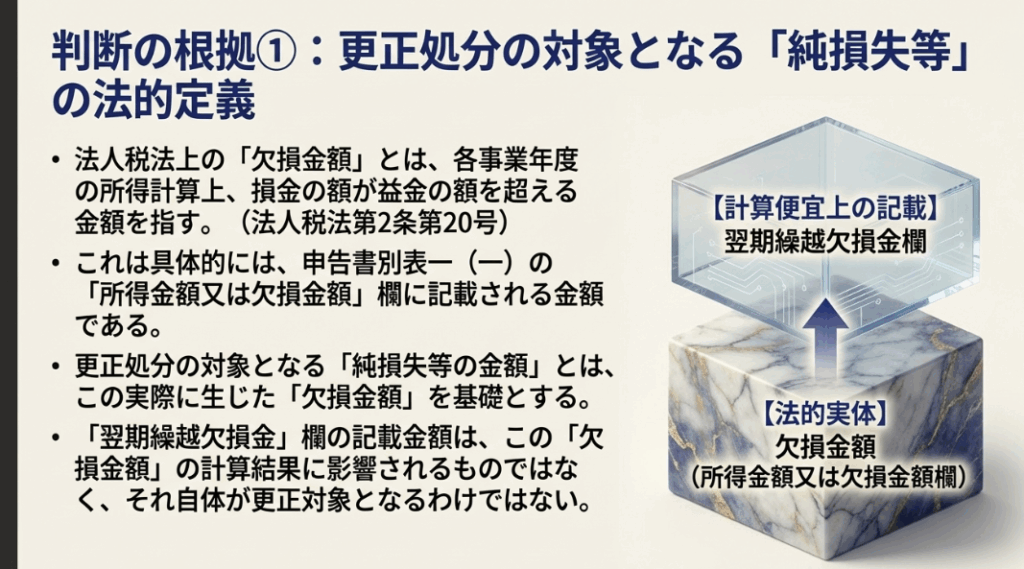 更正処分の対象となる「純損失等の金額」とは、法人税法第2条第20号に規定される「欠損金額」、すなわち、ある事業年度において損金の額が益金の額を超える部分の金額そのものを指すと指摘しました。