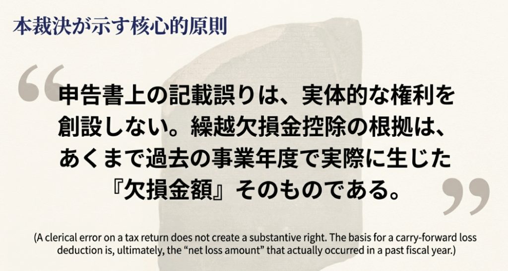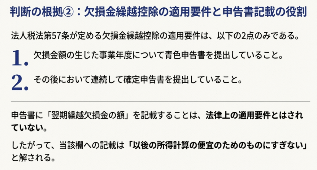 次に審判所は、法人税法第57条が定める繰越欠損金控除の適用要件に言及しました。その要件は、「欠損が生じた事業年度に青色申告書を提出し、その後連続して確定申告書を提出していること」のみであると指摘。申告書に繰越額を記載することは適用要件ではなく、「以後の所得計算の便宜のためのものにすぎない」と解釈しました。つまり、記載の有無や誤りが、納税者が持つ本来の控除の権利そのものに影響を与えるものではない、としたのです。