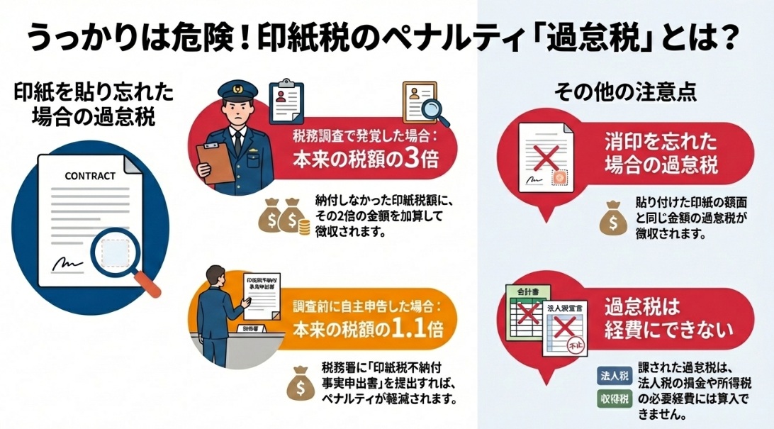 納付すべきであった印紙税を、課税文書の作成時までに納付しなかったことが税務調査などで指摘された場合、本来納付しなかった印紙税額とその2倍に相当する金額との合計額、すなわち当初に納付すべき印紙税額の3倍に相当する過怠税が徴収されます。