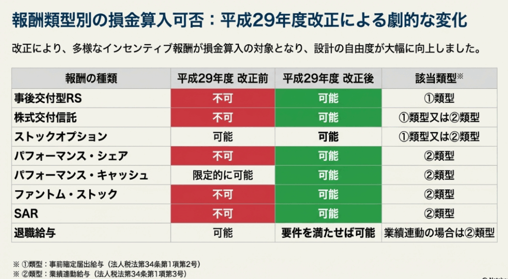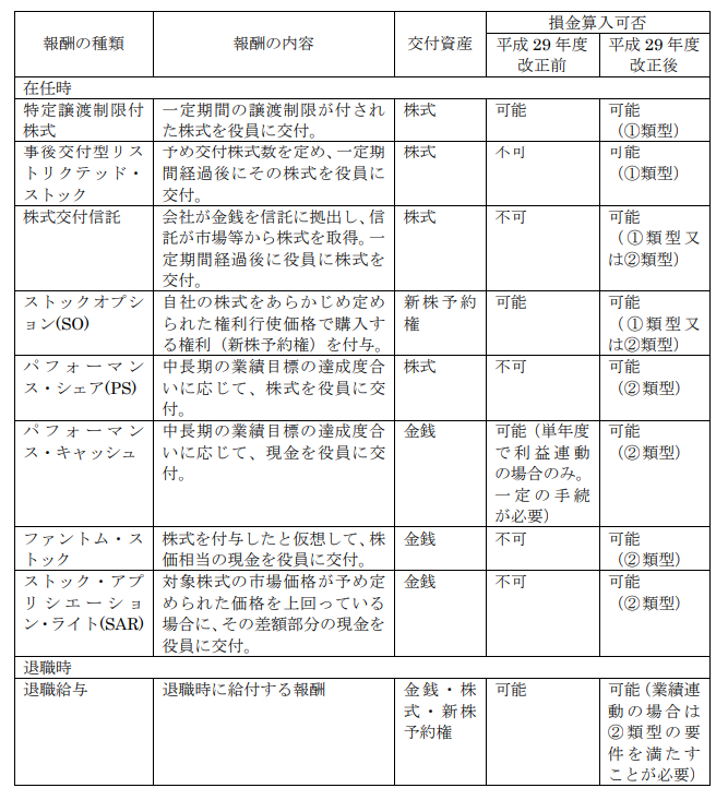 その結果、これらの報酬も、法人税法第 34 条第 1 項第 2 号(事前確定届出給与)または第 3 号(業績連動給与)に定められた一定の要件を満たせば、損金算入が可能となりました。