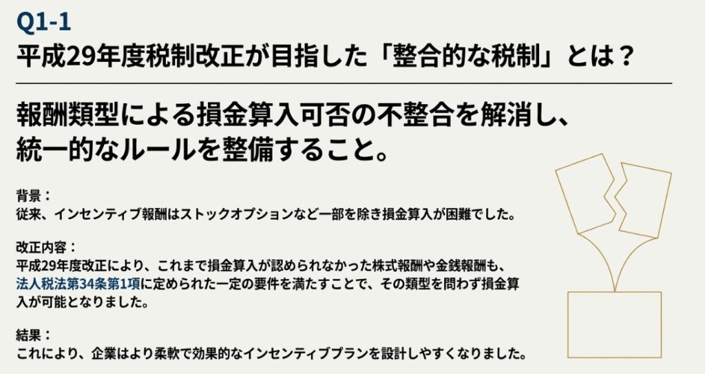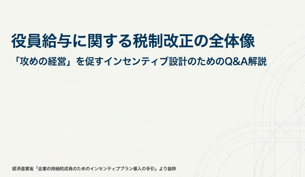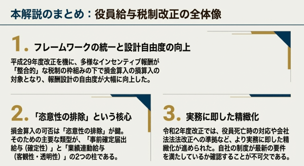 役員給給に関する一連の税制改正における最も重要な結論は、平成29年度の改正によって、従来は報酬のタイプごとに損金算入の可否が異なっていたものが、「恣意性を排除するための客観的な要件」 を満たすかどうかで一貫して判断されるルールに整理された、という点に尽きます。これにより、企業はより柔軟かつ戦略的にインセンティブ報酬を設計できるようになりました。