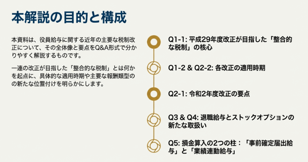 本稿では、特に平成29年度の税制改正を中心に、複雑に見える役員給与の税制の全体像を、新人や経理担当者の方にも分かりやすく解説します。まず結論として実務上の対応方針を示し、その後、Q&A形式で具体的な改正のポイントを深掘りしていきます。