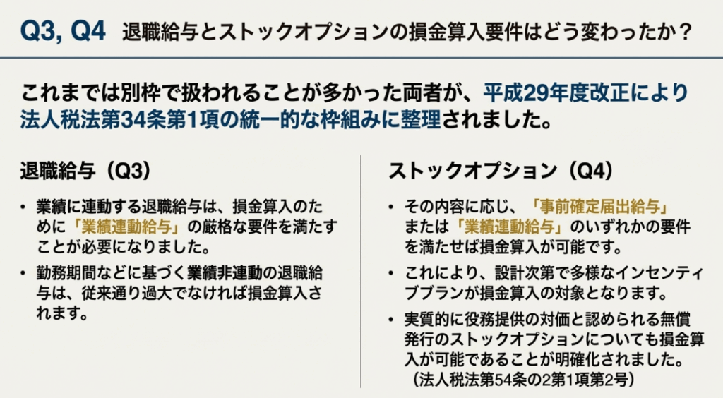 また、この改正では、従来は異なる条文で規定されていたストックオプションや退職給与も、法人税法第34条第1項の枠組みの中に整理され、役員給与全体として一貫したルールで判断されることになりました。