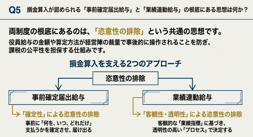 法人税法が役員給与の損金算入に厳しい要件を課す根底には、「恣意性の排除」 という考え方があります。これは税務当局が最も警戒するリスクを防ぐためのものです。
