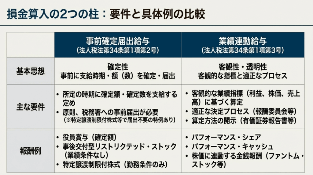 その設計内容に応じて、「事前確定届出給与」または「業績連動給与」のいずれかの要件を満たすことで損金算入が可能であることが明確化されました。例えば、権利行使価額や付与数が事前に確定しているものは「事前確定届出給与」、業績目標の達成度に応じて付与数が変動するものは「業績連動給与」として整理されます。