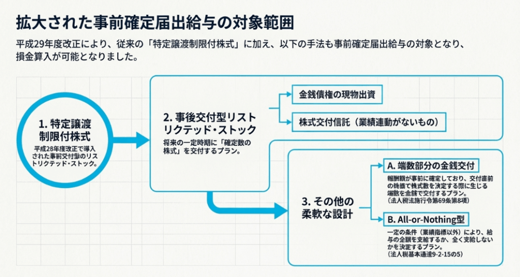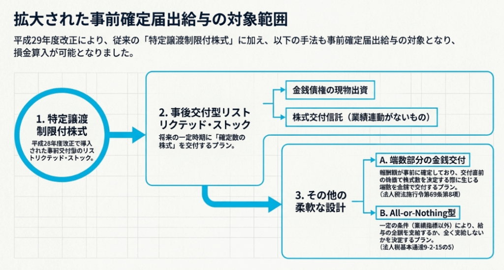 事前確定届出給与として対象となる株式報酬は、主に特定譲渡制限付株式および事後交付型リストリクテッド・ストック(これらをあわせて「事前確定型株式報酬」といいます)です。