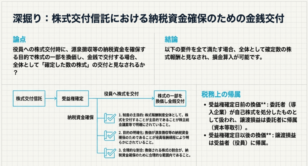 株式を付与すると、役員には即座に多額の納税義務が発生しますが、手元に納税資金がない場合があります。この実務的な問題を解決するため、「株式交付信託」を利用する際に、信託側で株式の一部を売却して納税資金に充て、残りの株式と金銭を合わせて交付することが認められています。