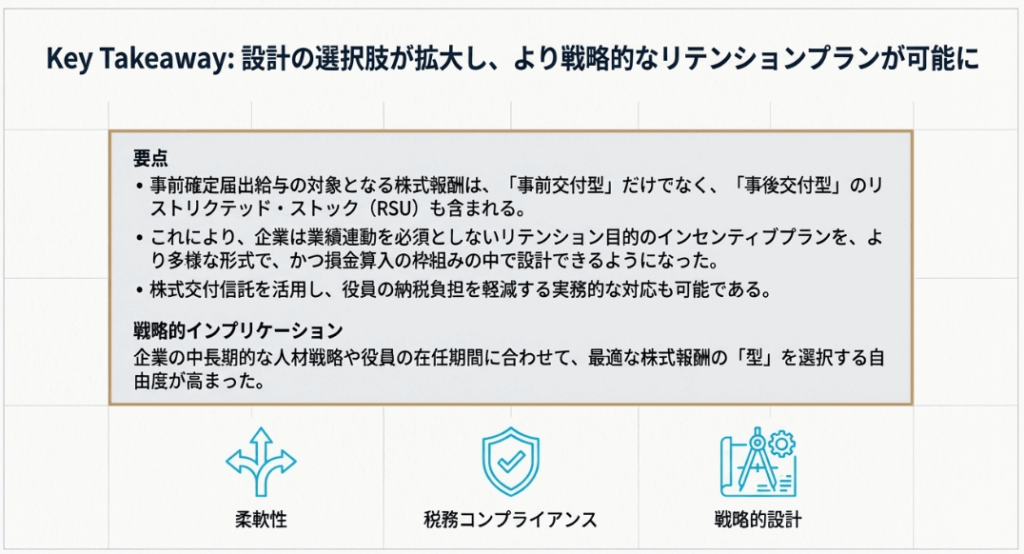 確定数の株式(事前確定届出給与)と、株価に連動する金銭(業績連動給与)を組み合わせて報酬制度を設計することも可能です。例えば、人材の引き留め(守り)を目的としてベースとなる譲渡制限付株式を付与しつつ、野心的な成長目標の達成に対するインセンティブ(攻め)として業績連動の金銭報酬を加える。このように、報酬制度は単なる経費ではなく、「攻めの経営」を駆動する戦略的なツールとなり得るのです。