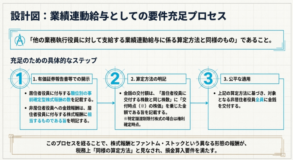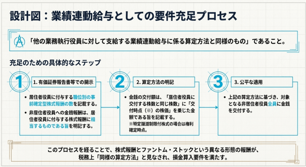 海外在住の役員へ株式の代わりに金銭を支給する場合、社内では「株式プラン」と呼んでいても、税務上は「業績連動給与」として扱われます。これは、事前確定届出給与のように届出をすれば済む話ではありません。報酬委員会の承認や有価証券報告書での開示といった、業績連動給与に求められる厳格なガバナンス要件を満たす必要があります。絶対に混同しないようにしてください。