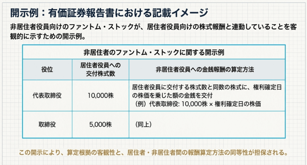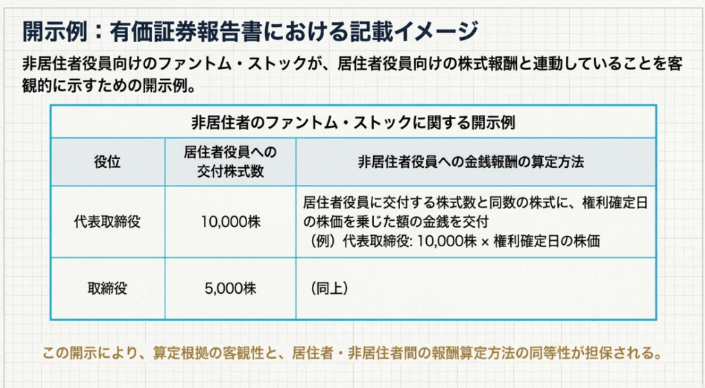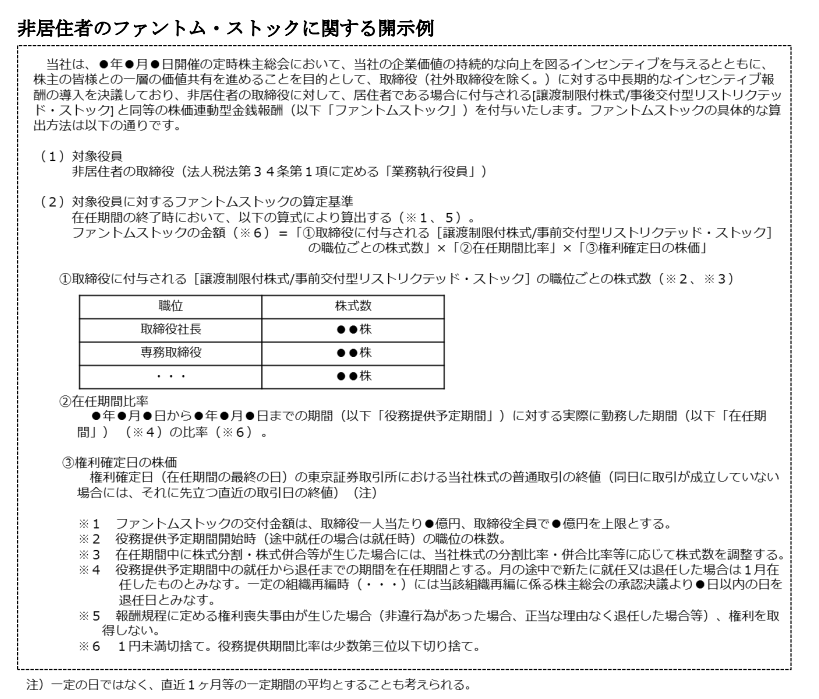 • 有価証券報告書等で、居住者役員に付与する職位別の株式数と、非居住者役員への金銭報酬がそれに相当するものである旨を開示する必要があります。