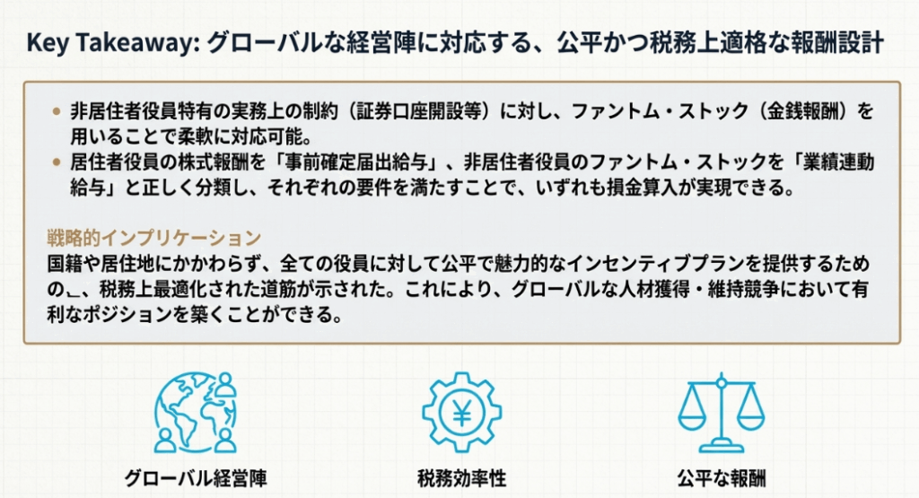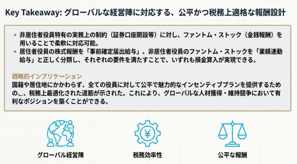 結論として、グローバルで統一されたインセンティブプランを導入したとしても、税務上は、国内居住者向けの「事前確定届出給与」と非居住者向けの「業績連動給与」という、全く異なる二つの制度を並行して管理・運用する必要があるのです。この認識が、国際的な報酬制度を成功させるための第一歩です。