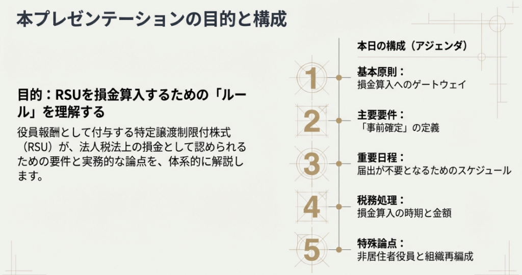本稿では、この譲渡制限付株式(RS)による役員給与について、どのような要件を満たせば法人税法上の損金として算入できるのか、その具体的なルールから実務上の注意点までを、新人スタッフや企業の経理担当者の皆様にも分かりやすく、網羅的に解説していきます。
