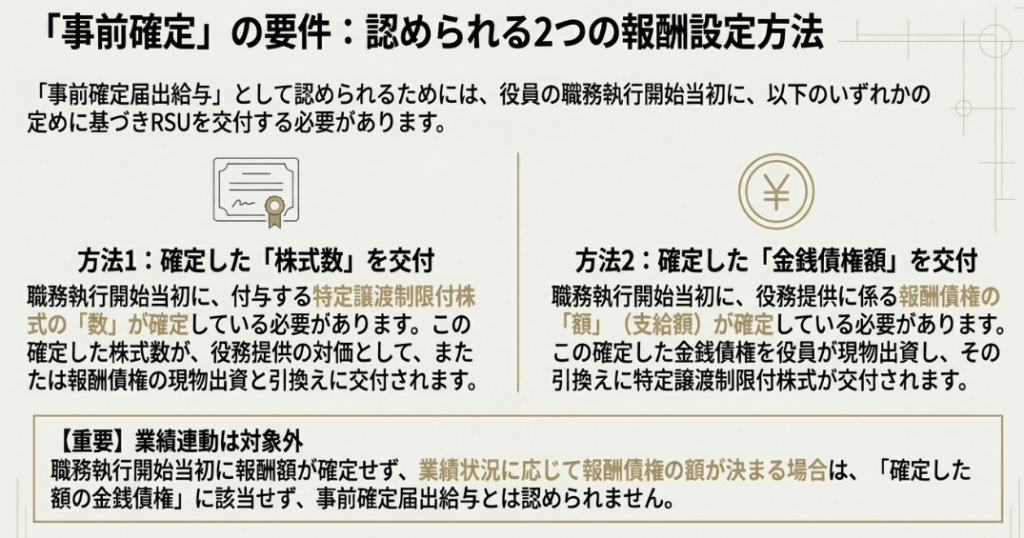 「事前確定届出給与」として認められるためには、役員の職務執行開始当初に、支給内容が「確定」している必要があります。これには、主に以下の2つのパターンが存在します。