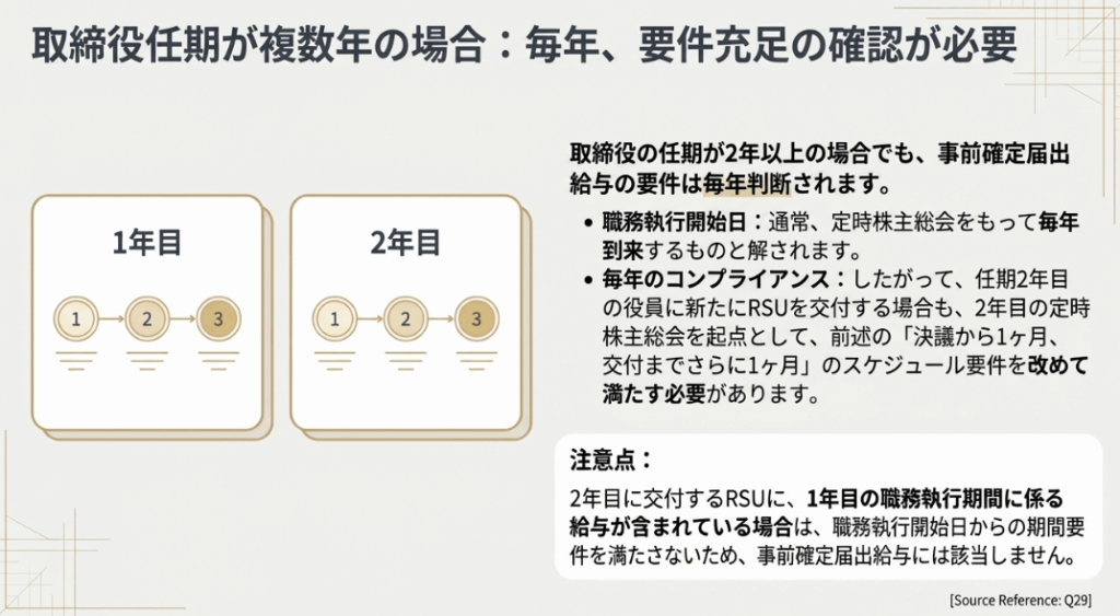 Q29 当社の取締役の任期は 2 年ですが、その取締役の 2 年目の給与として新たに「特定譲渡制限付株式による給与」を支給する場合の事前確定届出給与としての取扱いはどのようになりますか。