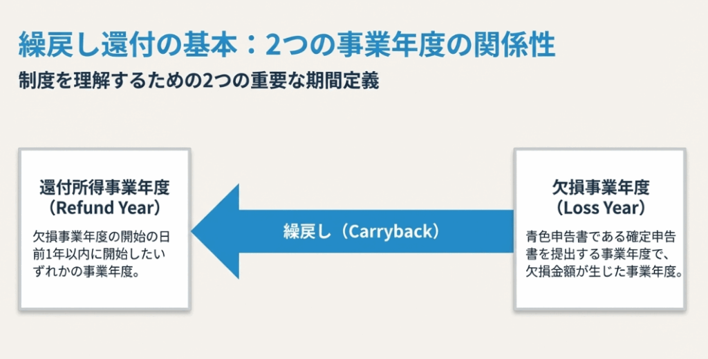 「欠損事業年度」とは、欠損金額が生じた事業年度を指します。一方、「還付所得事業年度」とは、その欠損事業年度が開始する日の前1年以内に開始した事業年度で、欠損金を繰り戻す対象となる所得があった年度のことです。