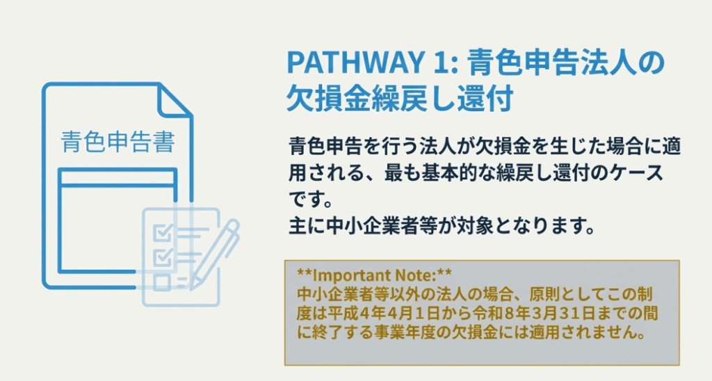 • ただし、この制度をいつでも利用できるのは主に「中小企業者等」です。大企業の場合は、解散や災害時など、適用が限定的な状況に限られます。
