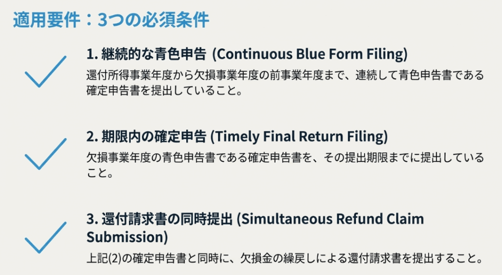 ①還付所得事業年度から欠損事業年度の前事業年度まで連続して青色申告書を提出していること、②欠損事業年度の青色申告書を提出期限までに提出していること、③その確定申告書と同時に還付請求書を提出すること、の3つです。