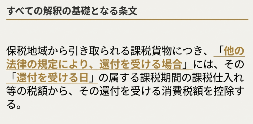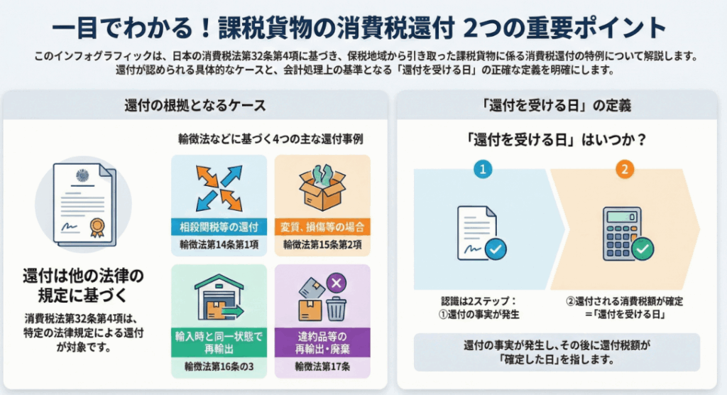 消費税法第32条第4項の特例は、保税地域から引き取った課税貨物について、他の法律の規定により消費税額の還付を受ける場合の「仕入れに係る消費税額の控除」に関するものです。
