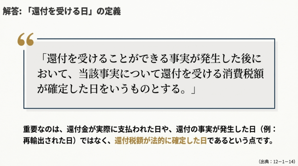 実務上のタイミングを決定づける最も重要な概念が、消費税法基本通達12-1-14に定められている「還付を受ける日」の定義です。通達では、これを「還付を受ける消費税額が確定した日」と規定しています。