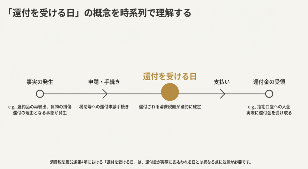 まず「還付を受けることができる事実」が発生し、その後、その事実に基づいて還付されるべき消費税の具体的な金額が確定します。この金額が確定した日が「還付を受ける日」となります。