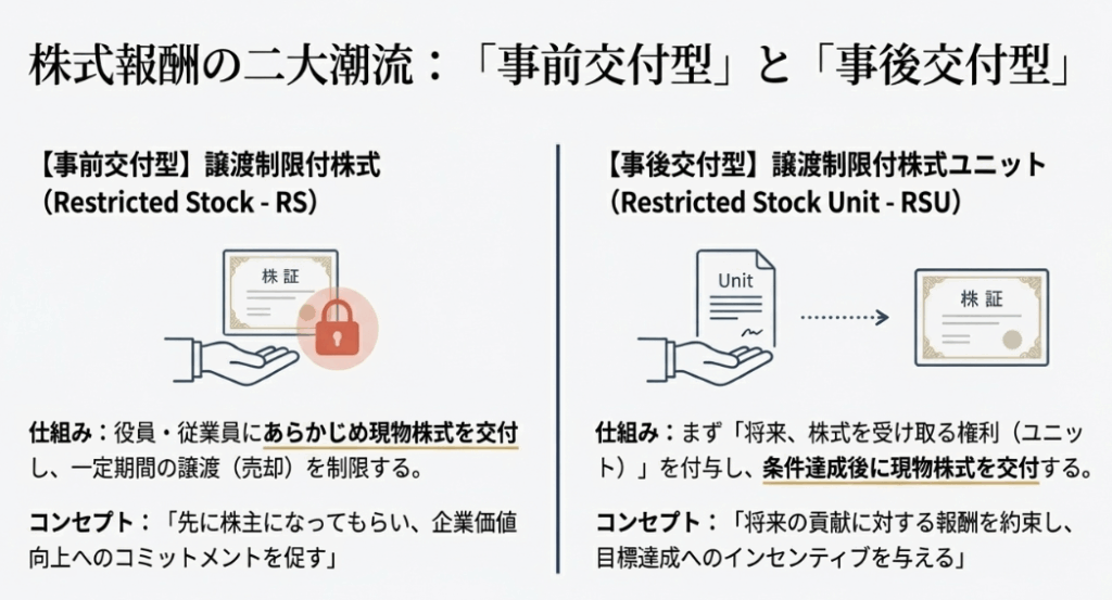 このセクションでは、RSとRSU/PSUそれぞれの制度概要と、実務上のメリット・デメリットを深く掘り下げていきます。どちらの制度を選択するかが、企業のインセンティブ戦略や人材戦略にどう影響するのか、具体的な視点を提供します。