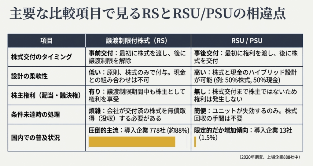 1. 譲渡制限付株式(RS)と譲渡制限付株式ユニット(RSU)の最も本質的な違いは何ですか?