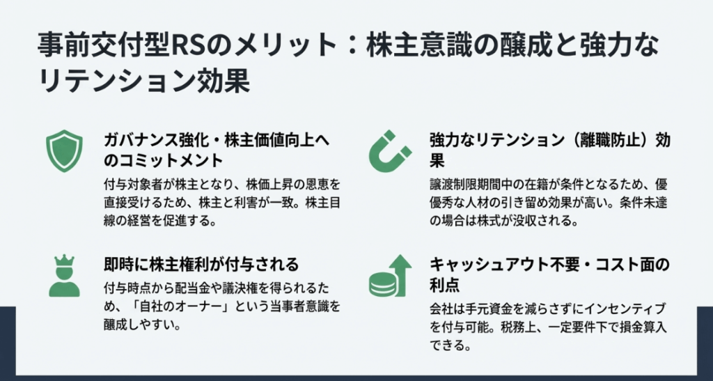 現物株式を先に交付するため、付与された対象者はその時点から株主となり、配当金を受け取ったり、議決権を行使したりする権利を持ちます。「会社のオーナーの一員」としての当事者意識を醸成しやすい点が大きなメリットです。