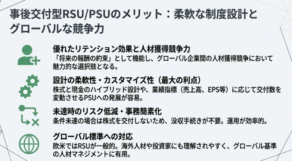 3. RSU/PSU制度が持つ「設計の柔軟性」とは、具体的にどのような利点を指しますか?