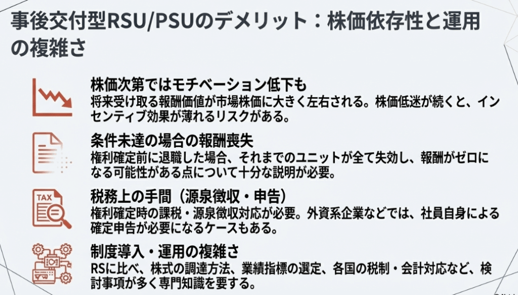 これらのデメリットを踏まえると、RSU/PSUは戦略的なインセンティブ設計を追求する企業にとって強力な武器となる一方、株価の変動リスクや複雑な運用管理に対応できる体制が求められる制度と言えます。